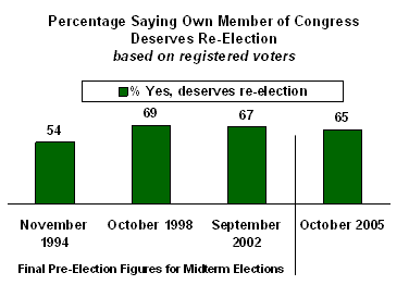 One bright spot for Republicans is that the percentage of voters saying their own member of Congress deserves re-election is holding on at the two-thirds level, similar to where it was in 1998 and 2002, and higher than what was seen in 1994.