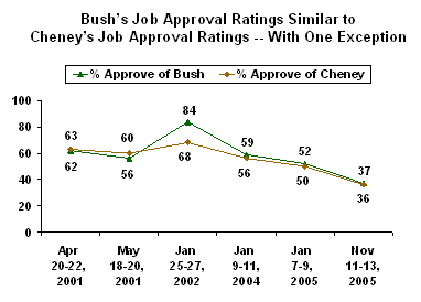 PRINCETON, NJ -- The latest CNN/USA Today/Gallup survey finds a 36% job approval rating for Vice President Dick Cheney, just a point lower than the job rating for President George W. Bush. While some observers have speculated that the vice president is losing popularity because of the indictment of his closest aide, Lewis "Scooter" Libby, the poll suggests that Cheney's ratings and Bush's ratings are closely tied to each other. Cheney's low rating in the most recent poll may be partially a result of the publicity surrounding Libby's indictment, but if that's the case, the Libby situation has most probably affected Bush as well.