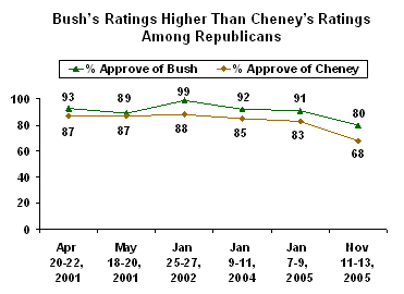 For each of the six times, Republicans gave a higher rating to Bush than to Cheney. The smallest gap was just 2 points (Bush's 89% to Cheney's 87% in May 2001), while the largest gap of 12 points shows up in the latest poll (80% for Bush vs. 68% for Cheney).