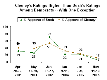 On the other hand, on five of the six measures, Cheney received higher ratings from the Democrats than did Bush. The only exception was the January 2002 reading, which was apparently still influenced by the 9/11 rally effect.