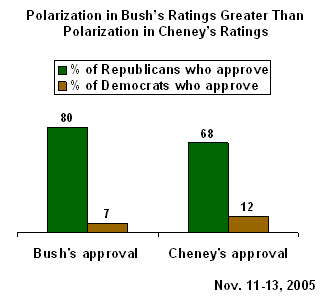 These results suggest that Bush tends to polarize the country more than Cheney. The difference in the president's ratings between Republicans and Democrats is now at 73 points, with 80% of Republicans approving of the president's job performance, compared with only 7% of Democrats. By comparison, Cheney's polarization score is 56 points -- 68% of Republicans approve of Cheney's performance, compared with 12% of Democrats.