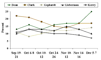 From a long-term perspective, the race has changed even more significantly. Late in the spring of this year Connecticut Sen. Joe Lieberman and Massachusetts Sen. John Kerry led among Democrats, while Dean was near the bottom of the list. Since then, both Lieberman and in particular Kerry have dropped significantly as Dean has risen in the poll's rankings.